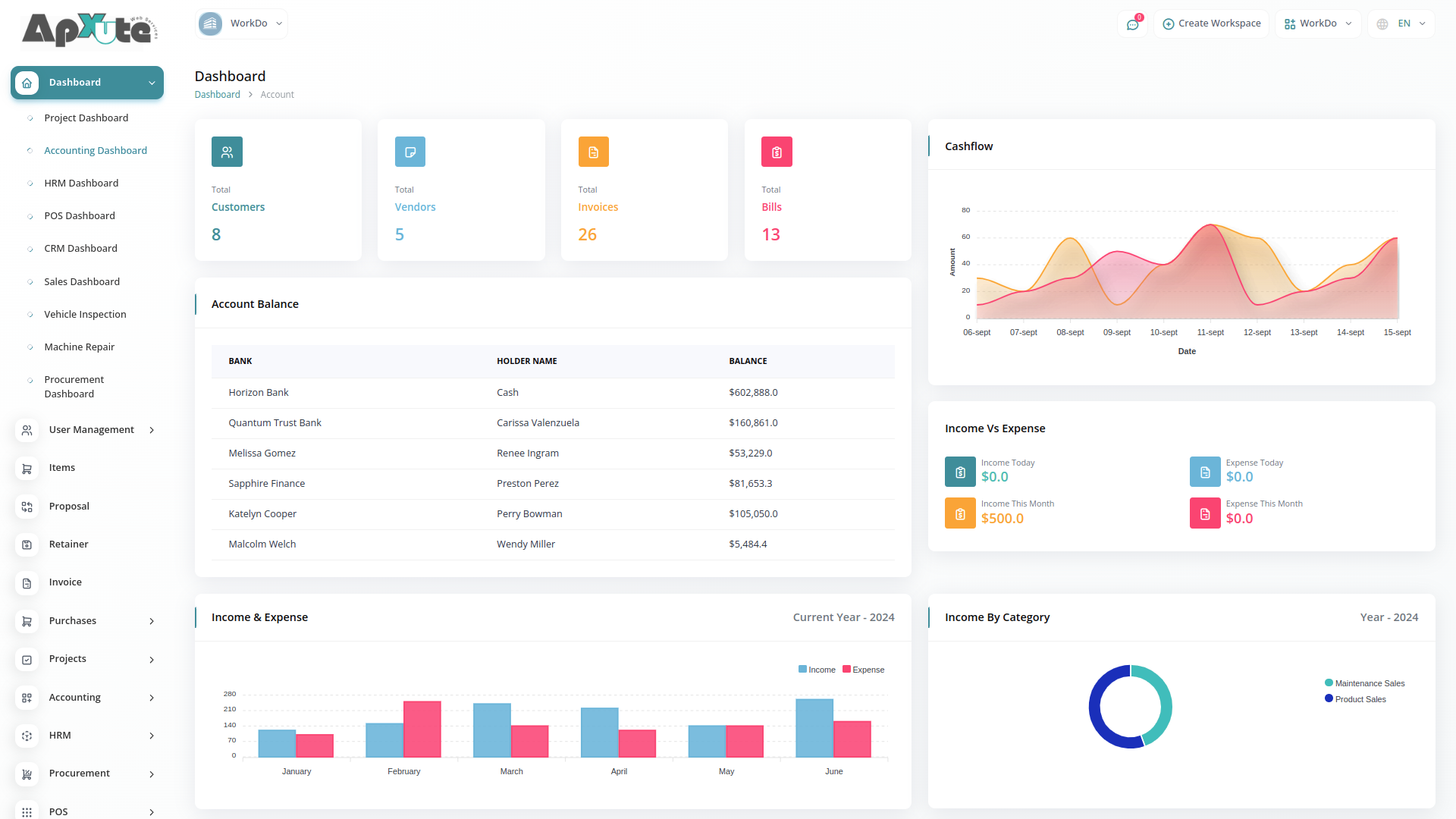 Account is an account management software that facilitates ease in revenue calculation by keeping a tab on all the accountancy matters of business. Based on Laravel, this accountancy software will make your business operations smooth and convenient. A graphical and tabular representation of various elements will help you make informed decisions for your firm.