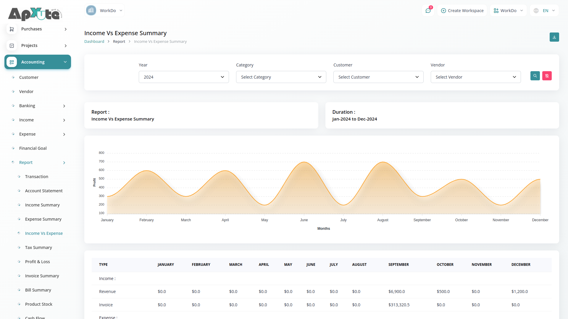 Get a report on transactions with an easy filtering option. Download the required account statements in either PDF, CSV, or Excel format. You get duly prepared reports on individual Income, Expenses, Tax, Invoice, and bill summary. Filter them based on Account, category, and customers. Also, a graphical display of the Income VS Expense chart along with a detailed calculation of Profit and Loss will help you make informed decisions. Filter the tax summary and Income VS Expense chart based on financial years.