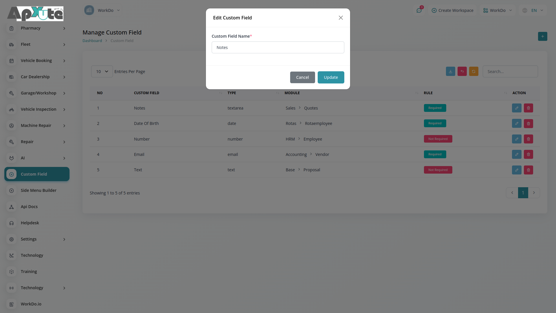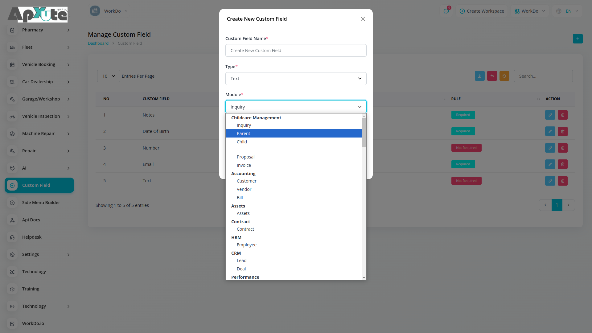 Custom Filed use in HRM, Account, Lead, Assests, Contract, Performance, Pos, Retainer, Sales, Taskly all modules.You can using custom filed collect additional information about all modules as you like.