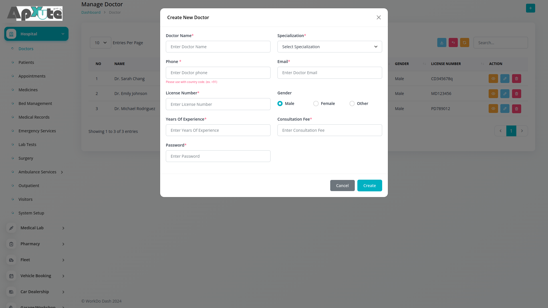 The hospital management system maintains a comprehensive database of all medical practitioners associated with the facility. Each doctor profile includes essential information such as their name, contact details, specialization, Years Of Experience, Consultation Fee, and license details.