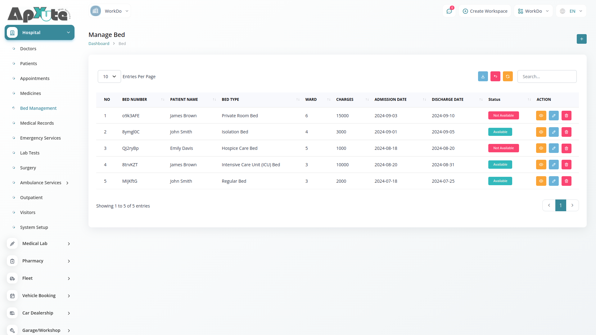 Bed management feature optimizes hospital bed allocation. In which the system provides Bed Type, Ward, Patient Assign, Charges, Admission Date, Discharge Date and Status allowing staff to efficiently assign beds based on patient needs.