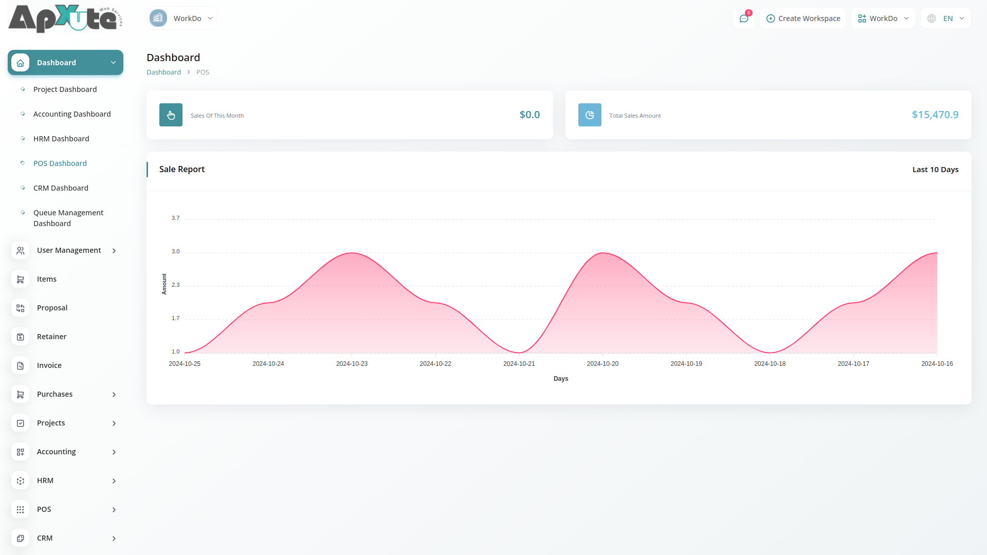 Welcome to the POS Module in ApXute, your ultimate solution for streamlined sales management. Our platform offers a user-friendly dashboard where you can easily navigate through your sales activities. At the heart of the dashboard is a dynamic chart representing your sales reports, providing valuable insights into your business is performance. Whether you are a small retail store or a bustling restaurant, our POS Module empowers you to efficiently manage your sales process from start to finish.