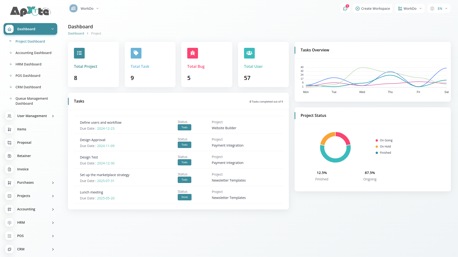 Get an overview of the total number of projects, tasks, bugs, and members. A visual representation of the task overview and project status can help you estimate the progress on each task. Lastly, you can check the top due task.