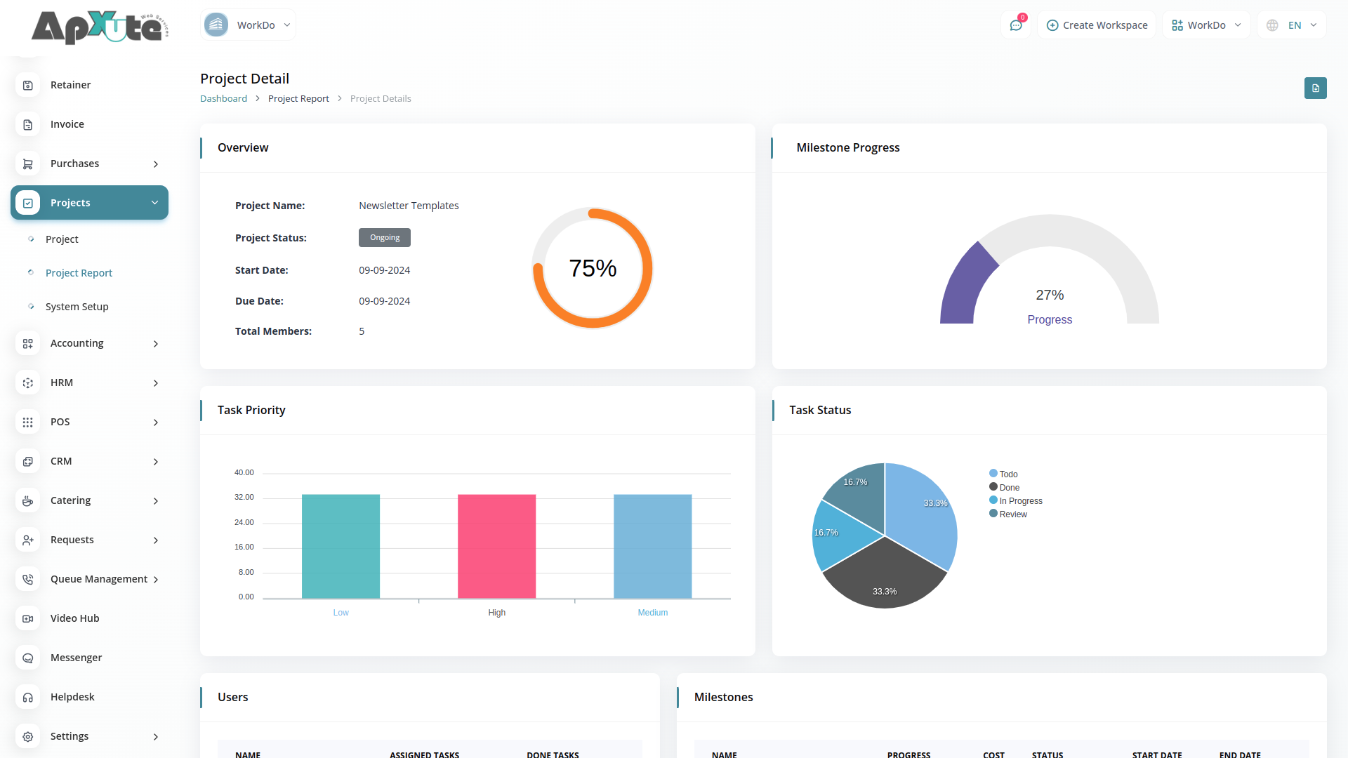 Attach cost and summary to milestones and change the status through the drop-down menu. Get a tab on recent activities of a project and also a graph about progress. Along with that, you can check your tasks’ details under project details with the help of the Gantt Chart.