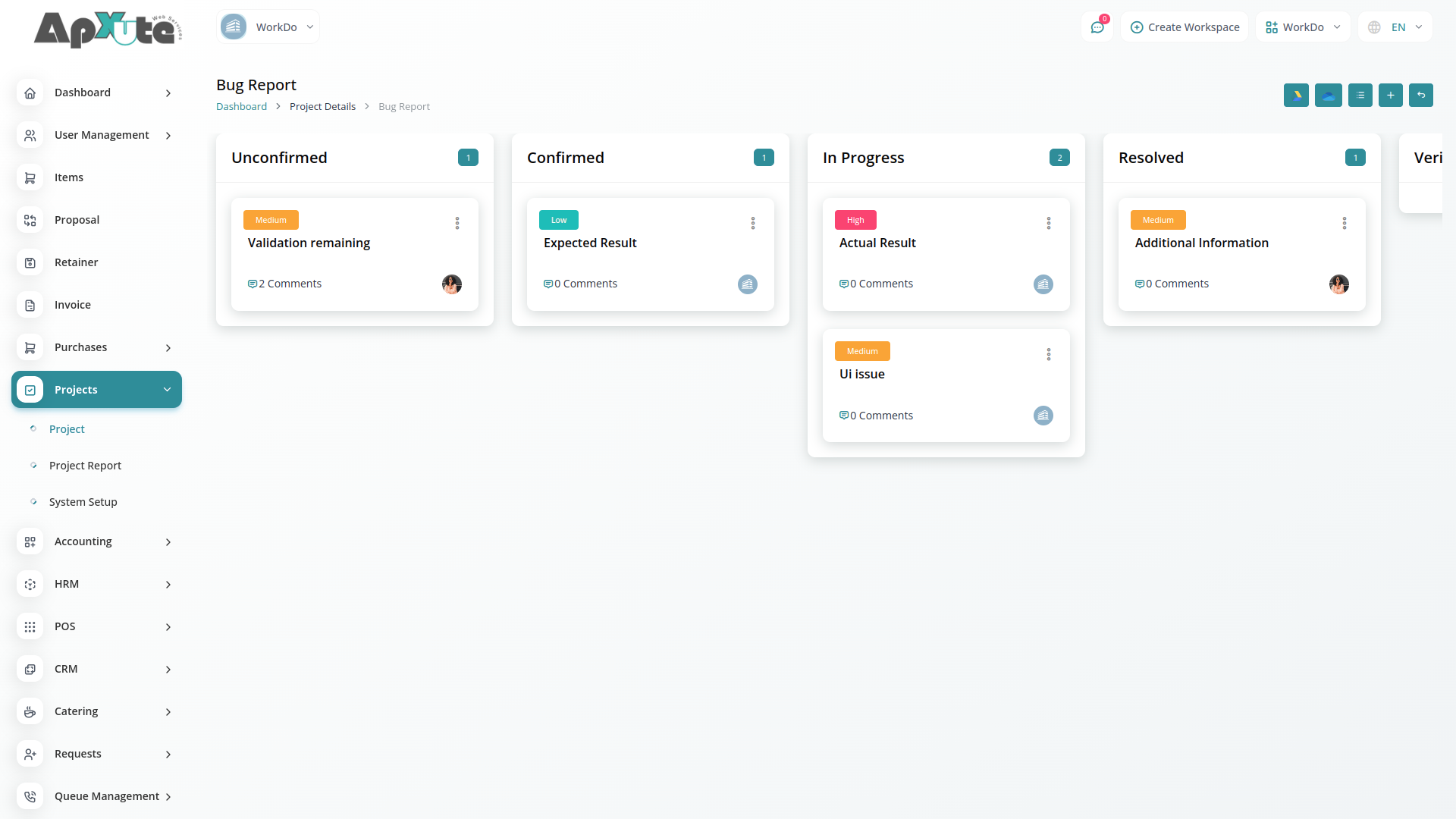 Create new bugs and assign users and priority to them. You can write a note in the text box for the bug description. Also, the status of each bug could be changed through an easy drop-down and Kanban drag system.