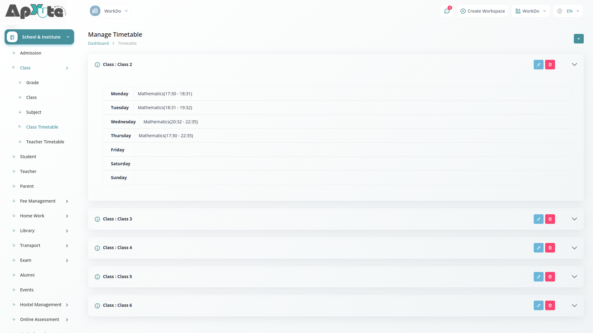 The Class Management section empowers administrators with a comprehensive view of academic structures. From the number of classes to subjects, class timetables, and teacher timetables, this section serves as a centralized hub for overseeing various academic aspects. The flexibility to edit or delete entries provides administrators with precise control over the academic framework, allowing for real-time adjustments to meet evolving needs.